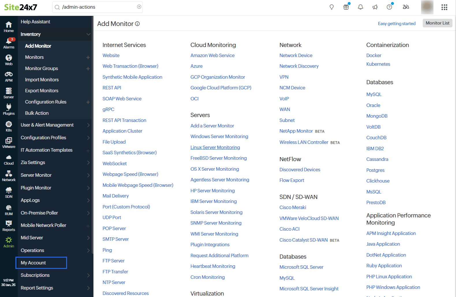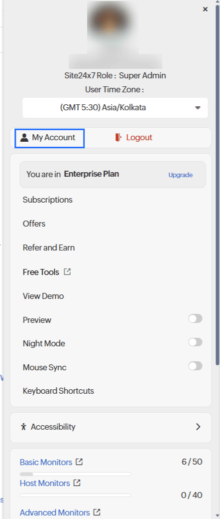- Site24x7 Plan: Displays the current subscription plan with an option to view subscriptions.