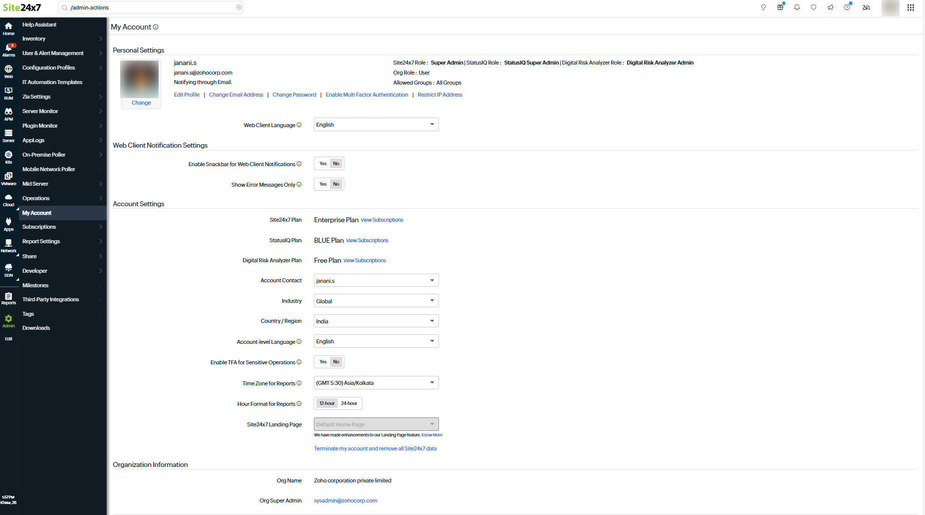 View your personal details, security preferences, notification behavior, and account-level settings on the My Account page. From this page, users can update profile information, modify the language of your web-client, control sign-in security, configure how notifications are displayed in the web client, and review account and organization details—all without affecting monitoring configurations.