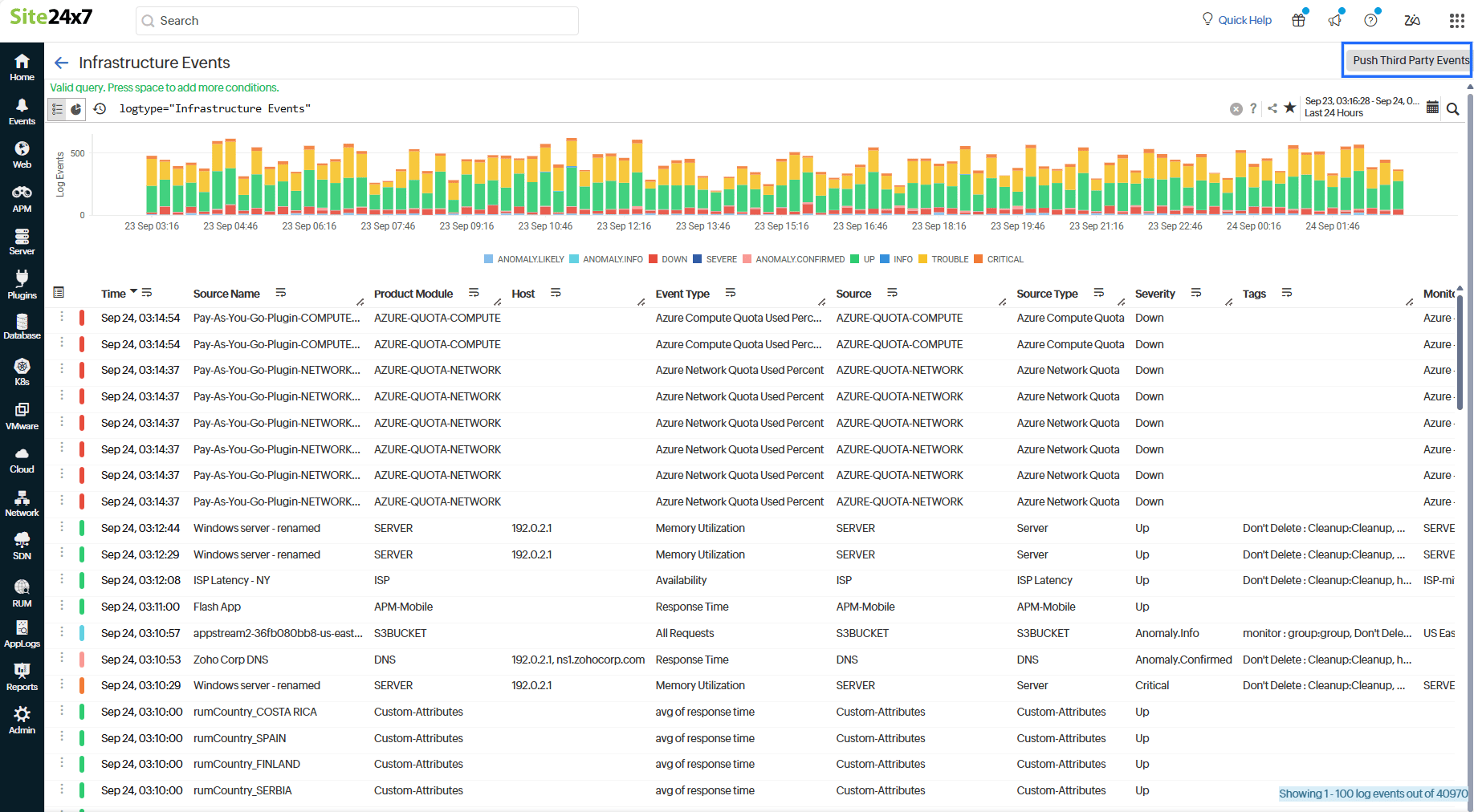 In Site24x7, every event including a status change, threshold breach, anomaly detection, configuration update, or an application build change is recorded as an Infrastructure Event. These events are stored in Applogs and can be retrieved using queries. Infrastructure Events cover a wide range, including status-based events, performance events, availability events, inventory changes (such as an IP or CPU update), and application-level changes. This consolidated view makes it easier to analyze, and correlate events across your entire IT stack.