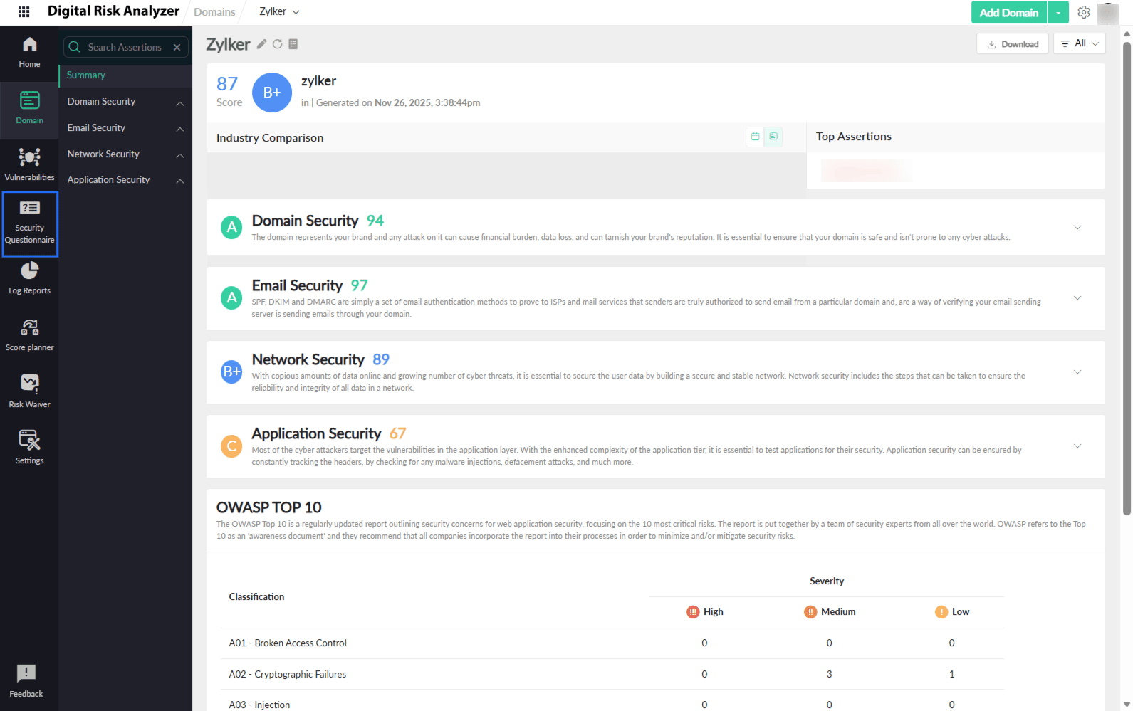 Any organization would want to understand the security posture of a vendor or partner before collaborating with them. Digital Risk Analyzer simplifies this evaluation with its Security Questionnaire feature. Users can share a standardized cybersecurity questionnaire covering key areas such as application, network, domain, and email security to vendors. The questionnaire assessment provides a structured and comprehensive view of a vendor’s security readiness.