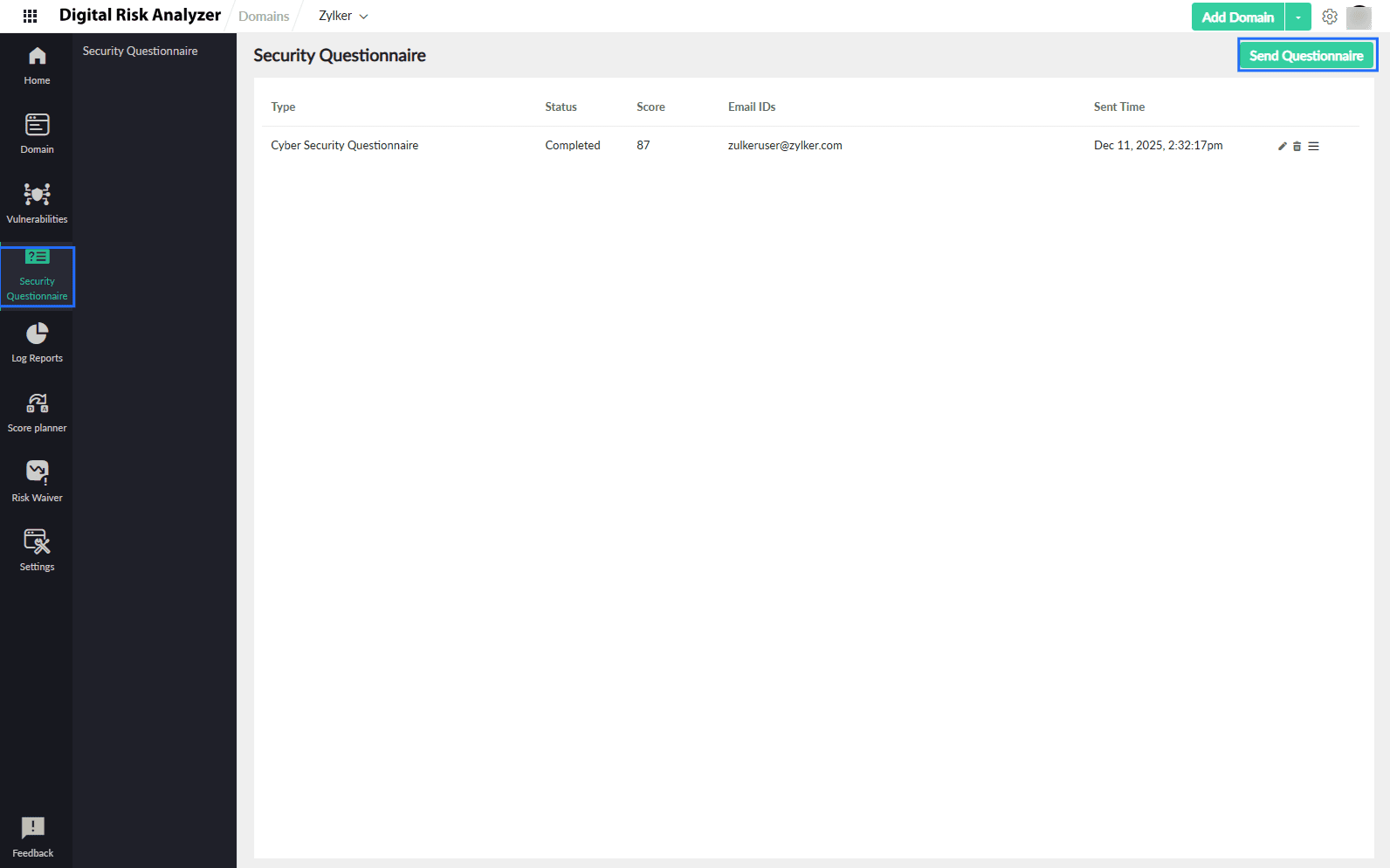 - In the left navigation menu, navigate to Security Questionnaire > Send Questionnaire.