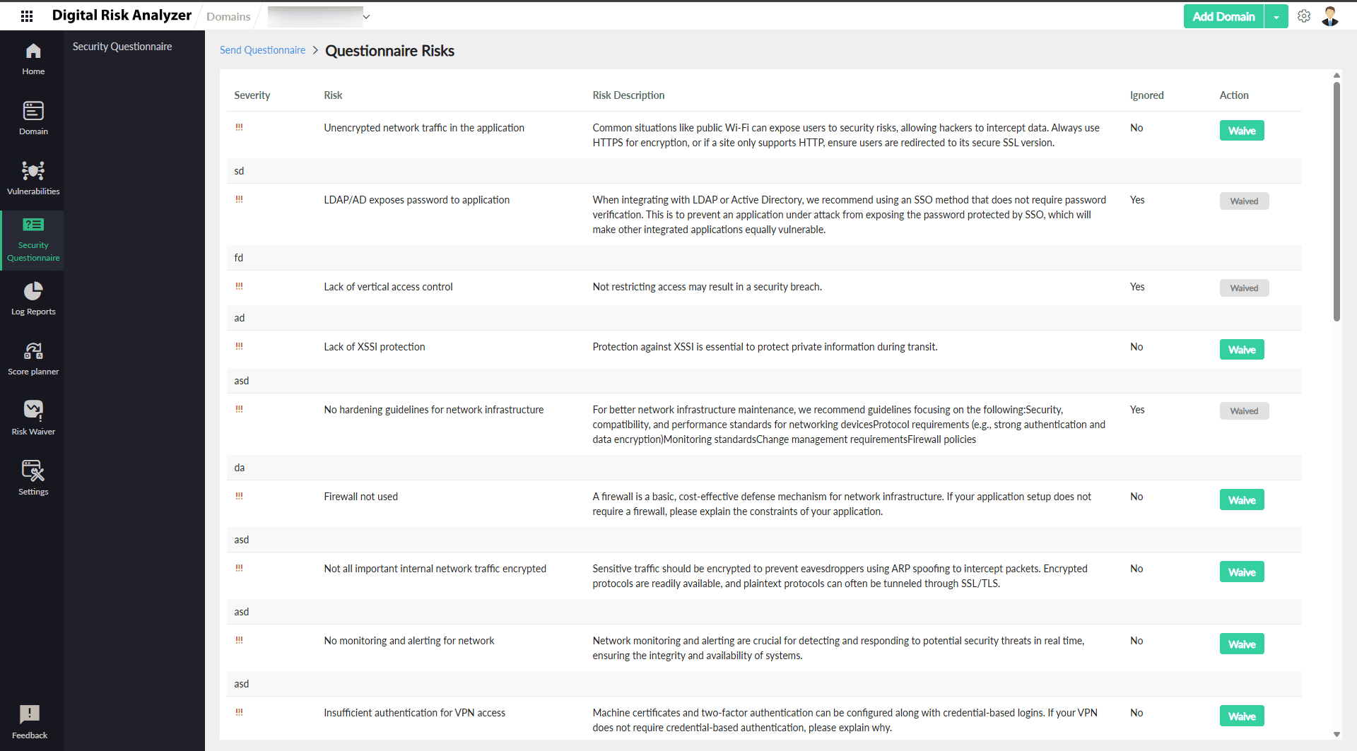 - From the Questionnaire Risks page, the user can analyze the vendor risk and comments and waive any risks using the Waive button.