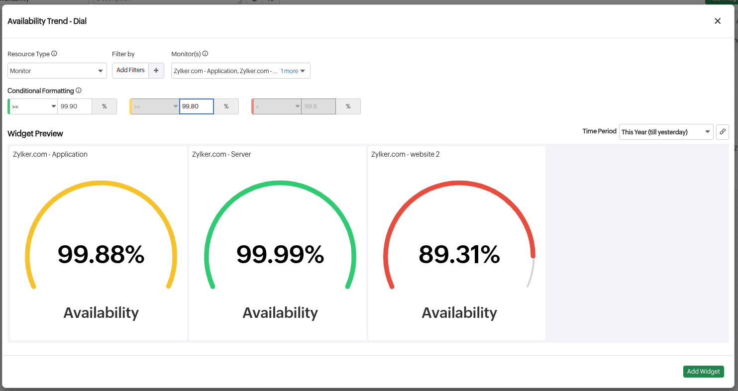 • Conditional Formatting: Define conditions and specify custom metric values to render the widget data in green, orange, or red to denote severity. Once the actual data breaches any of the conditions, the corresponding color is applied to the data.