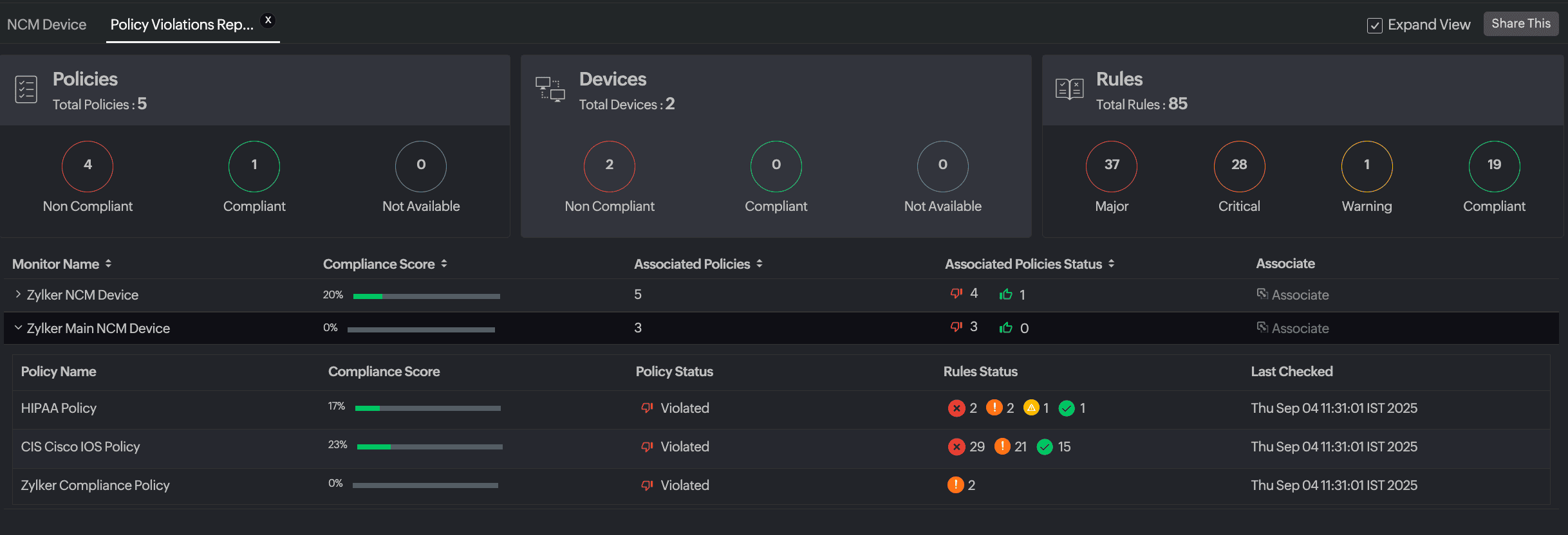 The Compliance Report in Site24x7's network configuration management (NCM) module helps you evaluate how well your network devices adhere to security and operational policies. It highlights policy violations, device-level compliance, and rule-level checks, enabling admins to take corrective actions and maintain regulatory or organizational compliance.