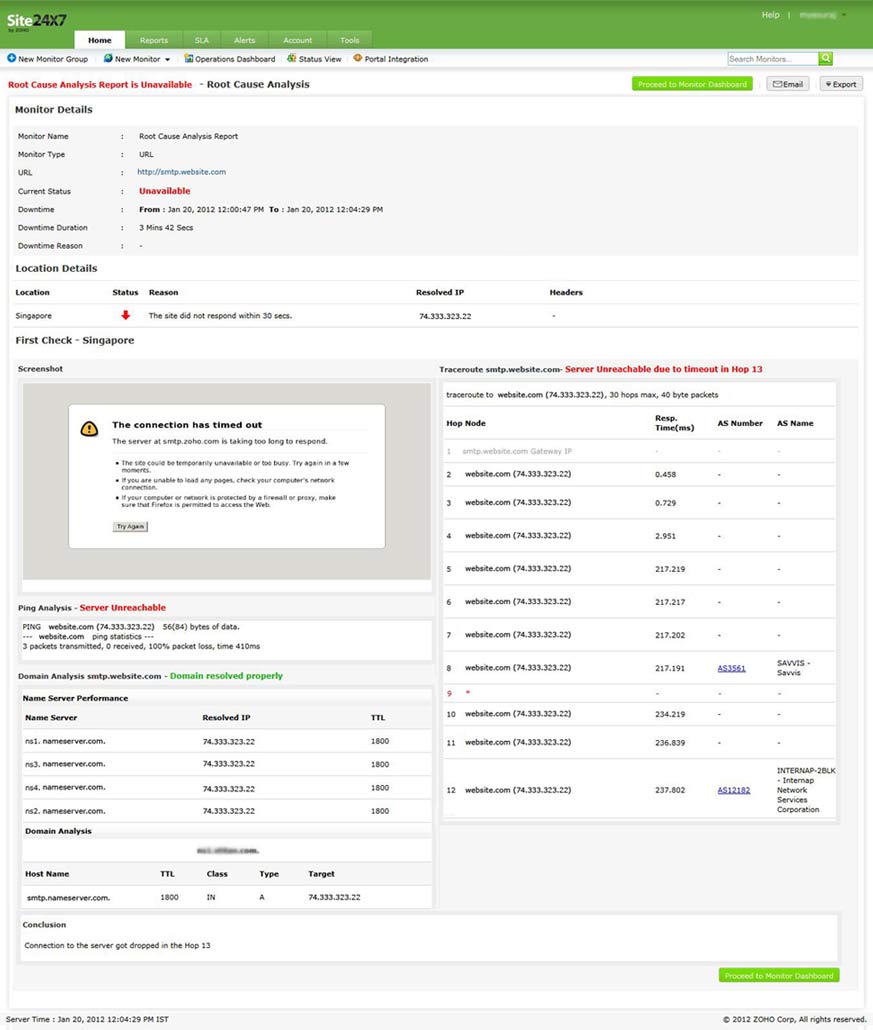 RCA has a wide range of statistics which helps you to zero-in on the real cause. A simple traceroute analysis helps you to quickly understand if any ISP is blocking the traffic or if your web hosting provider is causing the problem. With Ping analysis you can quickly find out what was the response time for your server.